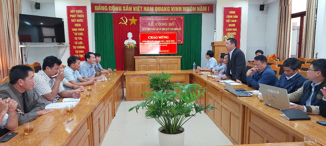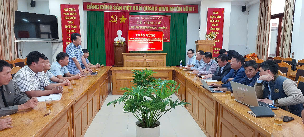 Chiều ngày 19 tháng 12 năm 2025, Vườn quốc gia Bidoup – Núi Bà tổ chức buổi làm việc, trao đổi, học tập kinh nghiệm với Đoàn công tác Ban quản lý Vườn quốc gia Núi Chúa – Phước Bình (Cơ quan Thường trực Ban Chỉ đạo Khu Dữ trữ sinh quyễn thế giới Núi Chúa tỉnh Khánh Hòa)